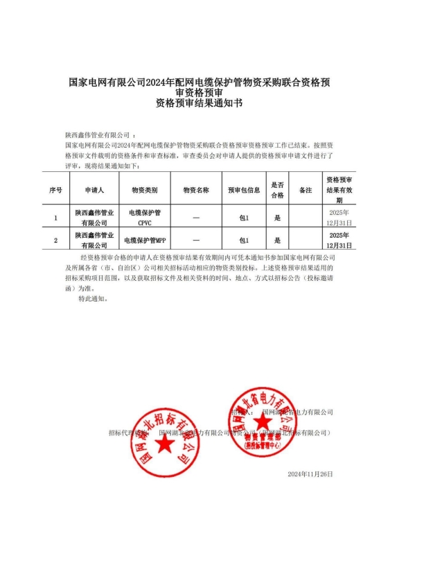 国家电网有限公司2024年配网电缆保护管物资采购联合资格预审资格预审资格预审结果通知书